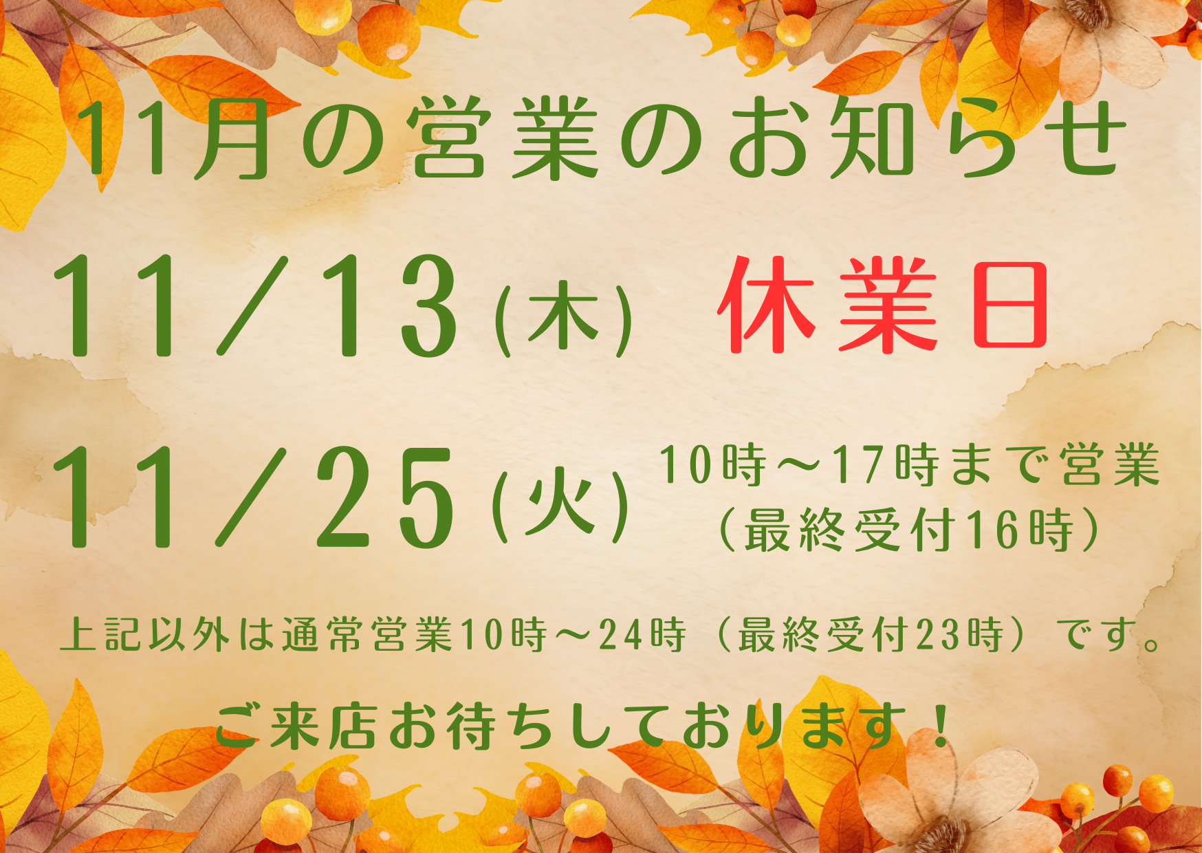 【11月の営業のお知らせ】